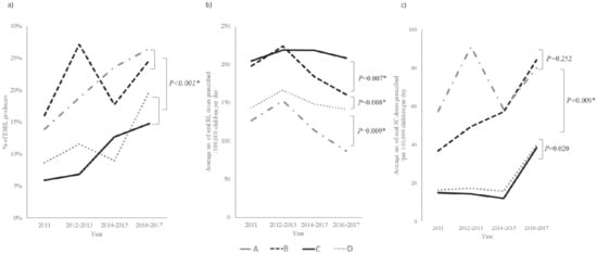 The overall regional trend in the increase in the proportion of ESBL-producing E. coli and Klebsiella spp. among uropathogens was investigated. The uropathogens at all four hospitals showed an increasing trend in the proportion of ESBL-producers from 2011 to 2017. However, hospitals A and B had a significantly higher proportion of UTIs in children caused by ESBL-producing uropathogens compared to hospitals C and D (P < 0.001) (Figure 3a).