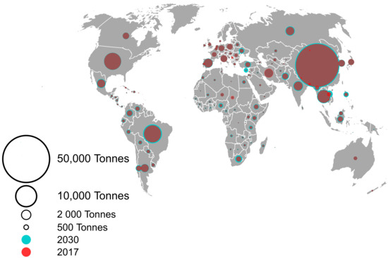 Antimicrobial consumption per country in 2017 and 2030. The size of the circles corresponds to the amounts of antimicrobials used. Dark red circles correspond to the amounts used in 2017, and the outer blue ring corresponds to the projected increase in consumption in 2030.