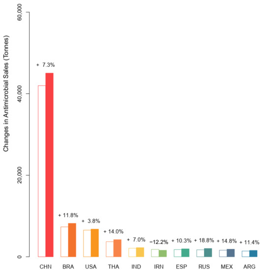 The top 10 consumers of veterinary antimicrobials by country in 2017 (open bars) and their projected consumption for 2030 (closed bars). CHN, China; BR, Brazil; USA, United States; THA, Thailand; IND, India; IRN, Iran; ESP, Spain; RUS, Russia; MEX, Mexico; ARG, Argentina.