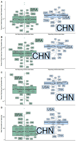 (A) Tonnes of cattle exports per cattle population in 2017 in countries reporting antimicrobial consumption (blue) vs. countries that did not report antimicrobial consumption (green); (B) Tonnes of chicken exports per chicken population in 2017 in countries reporting antimicrobial consumption (blue) vs. countries that did not report antimicrobial consumption (green); (C) Tonnes of pig exports per cattle population in 2017 in countries reporting antimicrobial consumption (blue) vs. countries that did not report antimicrobial consumption (green); (D) Meat consumption per capita (in kg) for countries that did and did not report veterinary antimicrobial sales data in 2017. Labels on all boxplots refer to the country’s ISO3 country codes. Size of the ISO3 code is proportional to the amounts of antimicrobials that each country was estimated to use in 2017.