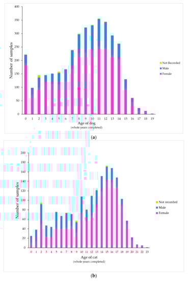 Distribution of samples by patient age and sex in (a) dogs and (b) cats.