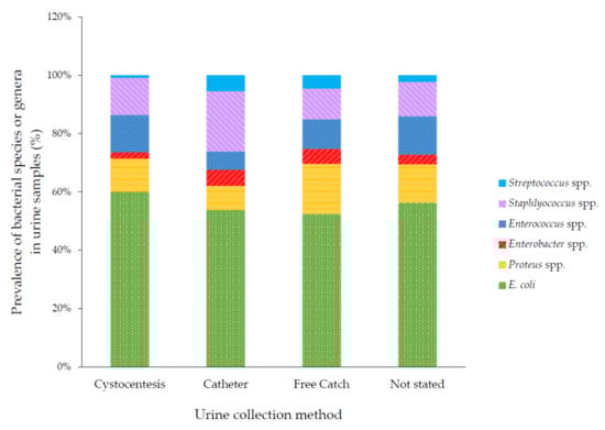 To avoid bacterial contamination from the urethra, perineum and other surfaces, cystocentesis samples are always preferable for MCAS, but these may be contraindicated in some circumstances and are not always readily obtained. This is reflected by the significant proportion of samples that were labeled as free catch (voided) or collected via a catheter in our study. Unsurprisingly, the urine collection method affected both the proportions of each of the bacterial genera cultured, as well as the likelihood of a mixed culture, as found in other studies [25]. This underlines the need for considered clinical interpretation of urine MCAS results, especially when a voided sample has been used.