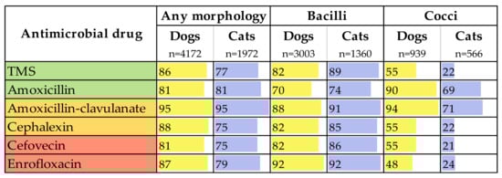 Accepting the previously mentioned limitations of our susceptibility data, the impact factors calculated for each antimicrobial [18] suggest that amoxicillin-clavulanate is the most rational choice for the empirical treatment of UTIs. However, this potentiated penicillin is a medium-importance antimicrobial, therefore agents with lower importance should be chosen where clinically appropriate to reduce the risk of selection for antimicrobial resistance. Amoxicillin and TMS are both low-importance antimicrobials with high efficacy against the urinary isolates examined in this study, and we demonstrated that bacterial morphology clearly determines differing superior choices: TMS for bacilli and amoxicillin for cocci. Most veterinary clinics in Australia are equipped for this point-of-care determination. If bacilli are identified, the impact factor of TMS approaches that of amoxicillin-clavulanate (82 vs. 88 in dogs and 89 vs. 91 in cats); a treatment duration of three to five days is recommended [1,12], and a trial in female dogs showed that three days of TMS was not inferior to 10 days of cephalexin [40]. Susceptibility results should always be interpreted by veterinarians in combination with their clinical judgment and consideration of relevant risk factors for individual patients. A number of adverse reactions to TMS have been reported in dogs and are outlined in the relevant guidelines. These include dose-dependent reactions, such as keratoconjunctivitis sicca and thyroid dysfunction, and delayed hypersensitivity reactions, including hepatopathy, blood dyscrasias and polyarthritis, which typically occur with courses of more than five days of therapy [41,42,43]. Challenges posed by hypersalivation in cats with oral TMS [44] can be overcome by using intact (not split) coated tablets, which are available in Australia and elsewhere. If cocci are identified, the expected efficacy of amoxicillin is very close to that of amoxicillin-clavulanate (antimicrobial impact factors of 90 vs. 94 in dogs, 69 vs. 71 in cats). In other words, 27 dogs or 40 cats would need to be treated with amoxicillin-clavulanate to achieve one additional cure, compared with amoxicillin.
