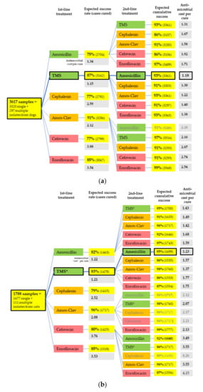 By accounting for the importance rating of each antimicrobial and the number of animals treated in each pathway, the treatment pathway with the lowest antimicrobial “cost” per cure for both dogs and cats was determined. This pathway was found to comprise initial treatment with TMS, followed by amoxicillin should this initial therapy fail (Figure 4).