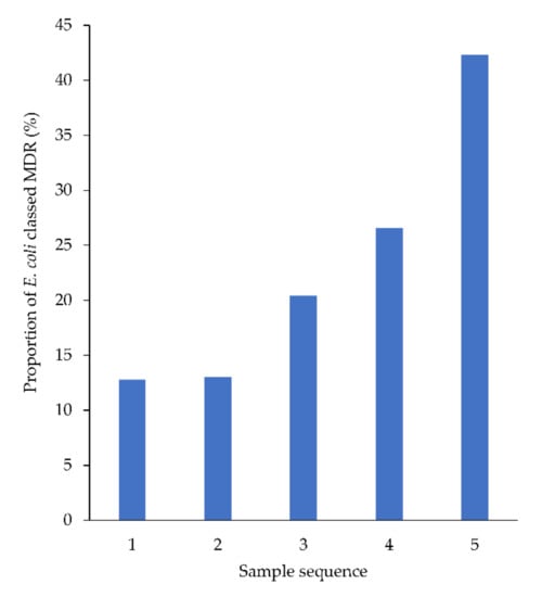 No changes in resistance patterns were detected across the population over time (Figure S2a–g, Supplementary Materials). However, in animals from which four or more urine samples were cultured during the study period, the proportion of E. coli classified as MDR increased by 7.3% with each successive sample, from sample 1 to 5 (95% CI: 4.3% to 10%) (Figure 5).