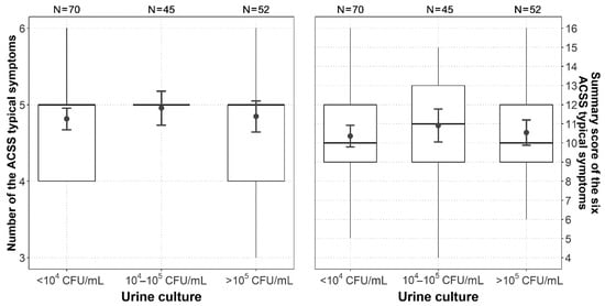 Boxplots (IQR, range, mean ± SD) of the number present and sumscore of the six ACSS typical symptoms in the US group versus the three categories of bacteriuria at Day 1.