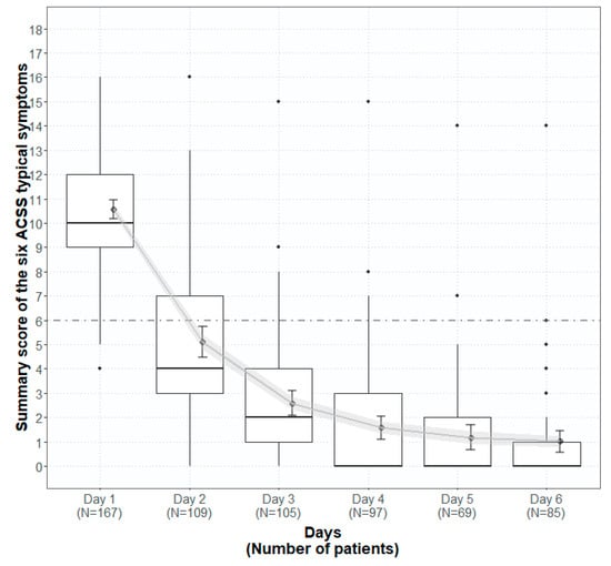 Figure 3 represents the summary score of the typical domain of the ACSS on Day 1–6 of the US cohort. The results demonstrated that after high sum scores at Day 1 before treatment (mean 10.6), for the following days during treatment, the sum scores were reduced quite distinctly and reached almost a plateau on Days 5 and 6. Therefore we investigated more carefully the 100 patients who filled in the ACSS questionnaire on Day 1 and the last time either on Days 5 or 6.