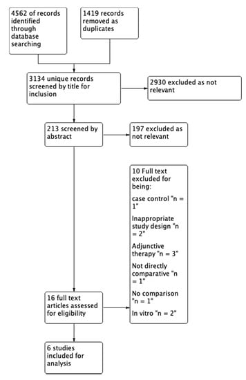 We identified 4562 studies (Figure 1). After removal of duplicates, 3143 studies remained, 2930 articles were excluded after title screening and a further 197 articles excluded after abstract screening. We obtained full-text copies of 16 articles and excluded 10. Of these, one study had clinical outcome measures different to other studies under review [12]. Three studies used ceftriaxone as an adjunctive therapy for the treatment of MSSA or did not describe MSSA infections [13,14,15]. Two studies were in vitro models [4,16], one [17] lacked a comparator and one study did not use ceftriaxone [18]. Two studies [19,20] assessed a population that presented with pneumonia not demonstrated to be due to MSSA.