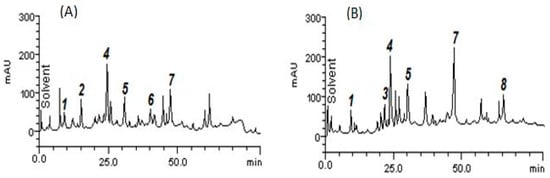 Mesosphaerum suaveolens extracts were injected onto reversed phase Phenomenex C18 columns (4.6 mm × 250 mm) packed with 5 μm diameter particles. The mobile phases A and B contained Milli-Q water, acidified to a pH of 2.0 with 1% acetic acid (A) and methanol (B). Correspondingly, the solvent gradient was used as follows: 0–10 min, 5% B; 10–25 min, 15% B; 25–40 min, 30% B; 40–55 min 50% B; 50–65 min 70% B; 65–80 min, 100% B, following the method described by Waczuk et al. [58] with slight modifications. The M. suaveolens extracts were analyzed at a 12 mg/mL concentration, with a flow rate of 0.6 mL/min and injection volume of 40 μL. The sample and mobile phases were filtered through 0.45 μm membrane filter (Millipore) and then degassed by ultrasonic bath prior to use. Standard reference stock solutions were prepared in methanol:water (1:1, v/v) at concentrations ranging from 0.030–0.500 mg/mL. Quantifications were carried out by peak integration using the external standard method at 254 nm for gallic acid and ellagic acid, 280 nm for catechin, 327 nm for caffeic acid and chlorogenic acid, and 366 nm for quercetin, apigenin, and rutin. The chromatography peaks were confirmed by comparing their retention times with those of reference standards and by DAD spectra (200 to 700 nm). All chromatography operations were carried out at ambient temperature and in triplicates.