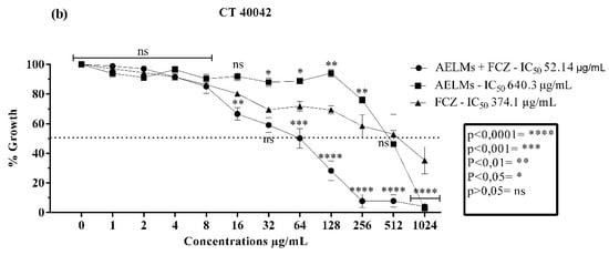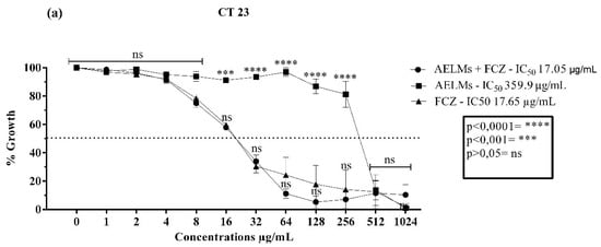 The aerial parts extract was able to potentiate the effect of fluconazole more effectively than the leaf extract (Figure 3). Such an effect was significant from the 16 µg/mL concentration for CA LM 77 (Figure 3a) and 32 µg/mL for CA INCQS 40006 (Figure 3b). Similar to the leaf extract, the AEAPMs presented antifungal effects at clinically relevant concentrations and were able to inhibit 50% of fungal growth at 18.5 µg/mL (CA LM 77) and 526.4 µg/mL (CA INCQS 40006) concentrations. It is noteworthy that C. albicans fungal growth was completely inhibited at the highest concentration of 1024 µg/mL.