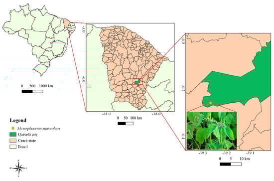 The M. suaveolens botanical material was collected in March of 2016 at a south-central region in Ceará-Brazil, municipality of Quixelô, under the following coordinates: latitude (−6°15’43.0056’), longitude (−39°16’2.5926”), 193.2 m above sea level (Figure 6). A sample specimen of the plant species was selected and identified by José Weverton Almeida Bezerra and was deposited in the Herbarium Caririense Dárdano de Andrade-Lima-HCDAL/URCA under the number #12,104.