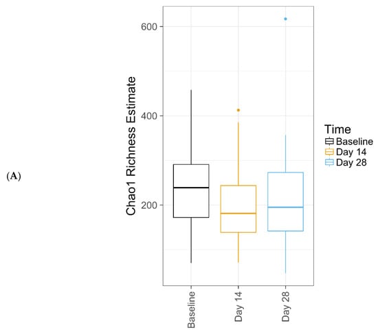 Data from 16 subjects were included in the fungal analysis. Subjects were only included if sample amplification was achieved for baseline and at least one more data point. In terms of fungal alpha diversity metrics across time, observed OTUs was 5.06, Chao1 Richness was 5.08 ± 0.08, and Shannon Diversity was 0.37 at baseline; respective values were 4.75, 4.75 ± 0.04, and 0.37 for Day 14, and 6.31, 6.31 ± 0.05, and 0.48 for Day 28.
