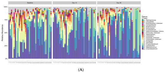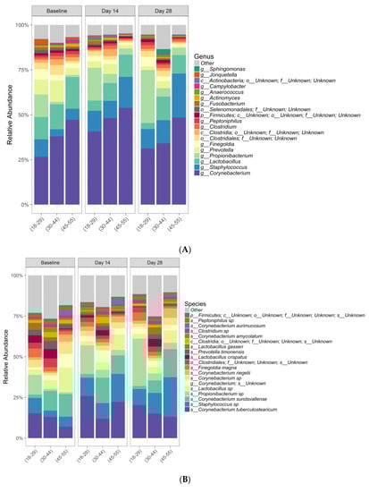 Data from 34 subjects were included in the bacterial analysis. Extraction controls and negative PCR controls were all reported as negative after amplification and sequencing (data not shown). Comparing bacterial alpha diversity metrics across time, observed OTUs (Operational Taxonomic Unit) was 222.74, Chao1 Richness (abundance-based estimator of species richness) was 246.64 ± 9.64, and Shannon Diversity (estimator of species richness and species evenness) was 2.58 at baseline; respective values were 176.47, 201.55 ± 10.83, and 2.37 for Day 14, and 186.56, 210.2 ± 10.16, and 2.36 for Day 28. ANOVA test for effect of time on either bacterial species richness or diversity showed no significant change (Table 4). Chao1 Richness and Shannon Diversity within the total bacterial microbiome data colored by time are illustrated in Figure 2. Individual subject bacteria data are attached in Supplementary Materials Figures S1–S3. Figure 3 shows the relative abundance of the 19 most dominant bacterial genera and species in all samples by time. The most common bacterial communities found to be present at baseline and Days 14 and 28 were Corynebacterium spp., Staphylococcus spp., Propionibacterium spp., and Lactobacillus spp. No significant differences were found in any of the top species across three different time points, as shown in Table 5.