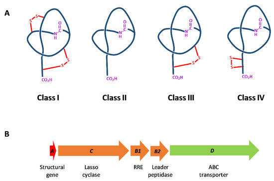 Among RiPPs, lasso peptides are cyclic peptides, containing an N-terminal macrolactam ring comprised of seven to nine amino acid residues and a linear C-terminal peptide tail threaded through the ring. Lasso peptides are classified into four classes, depending on the number of disulfide bonds present (Figure 1A) [11]: Class I lasso peptides, only produced by strains of Streptomyces, have two disulfide bridges in the molecule; class II lasso peptides have no disulfide bonds; and class III have only one disulfide bond. Tietz et al. [12] described the new class IV to include the topology of lasso peptide LP2006, which contains two Cys forming a disulfide bridge on the tail and not linking the tail to the macrocycle, as occurs in class I and III lasso peptides.
