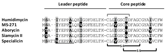 The humidimycin BGC (hum) was located by mining the genome of strain CA-100629 (data not shown). The core sequence of humidimycin (CLGIGSCDDFAGCGYAIVCFW) was used to query the genome sequence in a tblastn and allowed us to find an open reading frame (ORF) (humA) that unambiguously corresponds to the structural gene. Among the described siamycin-like peptides, humidimycin is the only one having an aspartic residue in position 8 (Figure 2). From the nucleotide sequence of humA, we were able to deduce the amino acid sequence of the leader peptide of humidimycin (MSAIYEPPALQEIGDFDELTK). As shown in Figure 2, the leader peptide is very similar to the leader peptides of MS-271, aborycin, siamycin II, and specialicin, and contains the conserved YxxPxL motif and a threonine residue that are required for leader peptide recognition by the RRE in Actinobacteria [11,12].