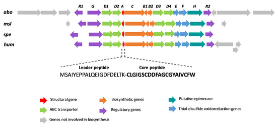 Schematic representation of the biosynthetic gene cluster (BGC) of siamycin-like lasso peptides (abo: aborycin BGC from Streptomyces sp. SCSIO ZS0098; msl: MS-271 BGC from Streptomyces sp. M-271; spe: specialicin BGC from S. specialis JCM 16611T; hum: humidimycin BGC from S. humidus CA-100629). The sequences of the leader and core peptides of humidimycin are shown.