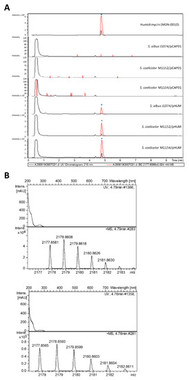 UV profiles at 210 nm (black) and extracted ion chromatograms (red) (A) at 2177.8588 ± 0.004 (C98H133N22O27S4+) of humidimycin, the negative controls S. albus J1074/pCAP01, S. coelicolor M1152/pCAP01, and S. coelicolor M1154/pCAP01, and the transconjugants S. albus J1074/pHUM, S. coelicolor M1152/pHUM, and S. coelicolor M1154/pHUM. ▼: humidimycin. (B) Experimental UV and mass spectra of M + H+ humidimycin adduct (C98H133N22O27S4+) from S. coelicolor M1154/pHUM (top), and from the original producer strain CA-100629 (bottom).
