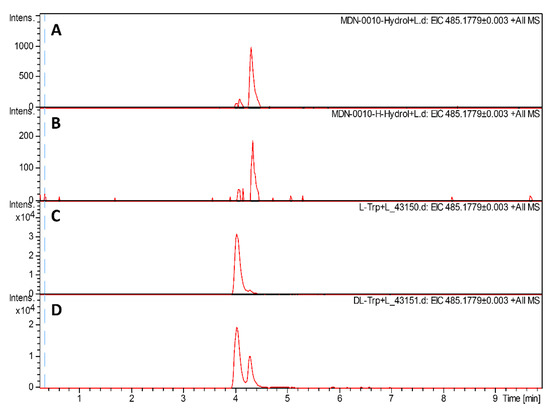 Marfey’s chiral analysis of the C-terminal tryptophan (Trp) using 1-fluoro-2,4-dinitrophenyl-5-L-valine-amide (L-FDVA). The LC-MS profile was monitored at 485.1779 m/z (M + H+ of FDVA derivatives of Trp). (A) Humidimycin from strain S. humidus CA-100629, (B) humidimycin from S. coelicolor M1154/pHUM cultures, (C) L-Trp standard. and (D) L-Trp + D-Trp standard.
