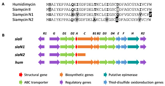 Comparison of the pre-propeptide sequences (A) and the biosynthetic gene cluster (BGC) (B) of humidimycin, siamycin II, and the new siamycins (N1 and N2) identified by genome mining.