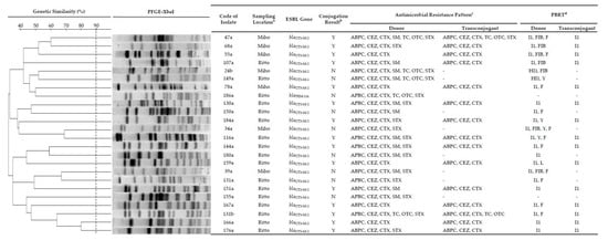 PBRT showed typing for 91.7% (22/24) of isolates. The plasmid replicons could not be characterized for 8.3% (2/24) of isolates. The IncI1 plasmid was highly distributed among ESBLEC isolates where the FIB, F, HI1, Y, and L groups were also detected. All ESBLECs investigated were genotypically diverse, as shown by a variety of PFGE patterns. Genetic similarity, ESBL type, antimicrobial resistance pattern and PBRT are summarized in Figure 1.