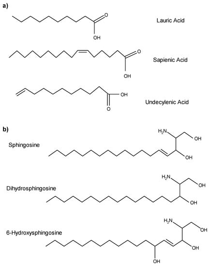 The chemical structures of antimicrobial lipids (AMLs) found on the surface of the skin and oral mucosa. (a) Sapienic acid is the major free fatty acid derived from sebum and lauric acid is the minor fatty acid derivative of sebum. Fatty acids demonstrating antimicrobial activity are generally 12–18 carbons and activity quickly decreases with either longer or shorter chains. Undecylenic acid is derived from sweat and also present on the skin surface. (b) Free sphingoid bases are derived from the stratum corneum, liberated via ceramidases, and exhibit broad antimicrobial activity.