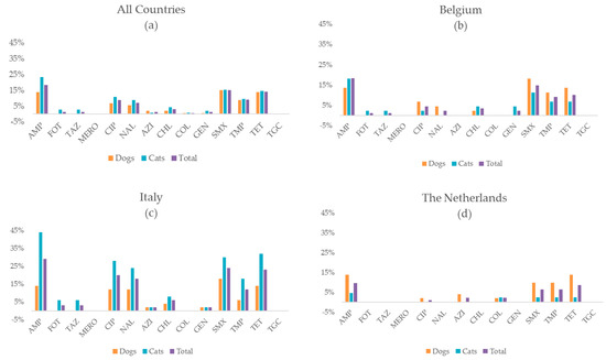 Antimicrobial resistance proportions (%) among Escherichia coli isolates from feces of dogs and cats in three European countries against a set of 14 antimicrobials. (a) Shown for all samples with a successful E. coli isolations from cats (n = 137) and dogs (n = 148); (b) E. coli from Belgian cats (n = 44) and dogs (n = 44); (c) E. coli from Italian cats (n = 50) and dogs (n = 50); (d) E. coli from Dutch cats (n = 43) and dogs (n = 51). AMP = ampicillin; FOT = cefotaxime; TAZ = ceftazidime; MERO = Meropenem; CIP = ciprofloxacin; NAL = nalidixic acid; AZI = azithromycin; CHL = chloramphenicol; COL = colistin; GEN = gentamicin; SMX = sulfamethoxazole; TMP = trimethoprim; TET = tetracycline; TGC = tigecycline. (Table S4).
