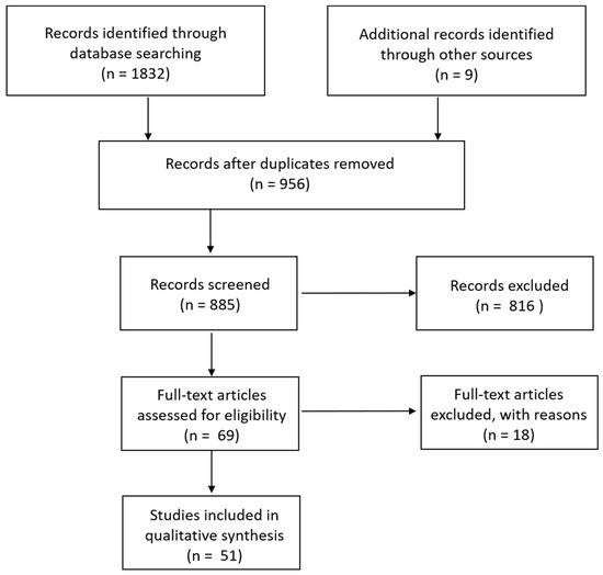 Searching within Pubmed resulted in 856 hits, Web of Science in 58, and peer-reviewed materials within ProQuest in 918, for a total of 1832 publications. Upon searching references for additional studies that had been missed by our search terms, another nine were added. Titles and abstracts were examined to exclude duplicates (956); this left 885 remaining. Additional publications were excluded if they used animals only as an experimental model rather than examined epidemiology in wild species (such as rats, guinea pigs, and rabbits) and those that only mentioned S. aureus within the discussion or otherwise rather than consisted of a study focused on S. aureus epidemiology in wildlife. This left 69 for analysis (Figure 1).