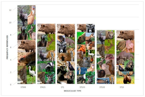 Indeed, ST425 is a dominant molecular type that was found in wildlife papers. It does not appear to have a particular host specificity, with isolation reported from mammals including rabbits [35], boar [35,40,53,55,57,58], red deer [35,40,54], and roe deer [40,44] and from vultures [75] (see also Table 1 and Figure 1); these were found exclusively in European countries. The significance of this finding is currently unknown. ST425 isolates are known to be zoonotic, and have been described as a human colonizer as well, and its ability to cross species barriers may facilitate transmission of resistance genes, including mecC [11]. Other key molecular types present in a wide variety of species included ST398 in Norway rats [30,31,32,33,34], brown hare [40], boar [53,54,56], red deer [53,54], Iberian ibex [54], vulture [75], white stork [76], Eurasian griffon vulture [54], and Canada goose [79] and ST130/CC130, found in a rabbit [35], hedgehog [37,38,40], wood mouse [41], brown rat [40], yellow-necked mouse [42], house mouse [42], brown hare [37,40], mara [48,49], red fox [40], boar [35,55], red deer [35,59], Iberian ibex [53], fallow deer [40], and blue-winged teal [44]. The latter includes a large number of small animals and rodents, suggesting these may be an important reservoir in addition to livestock [91], and ST398 is a known colonizer of humans, particularly those with livestock contact [84]. Colonization may result in transmission of antibiotic resistance genes between species, while ST398 is also capable of causing a wide range of infections in humans [92].