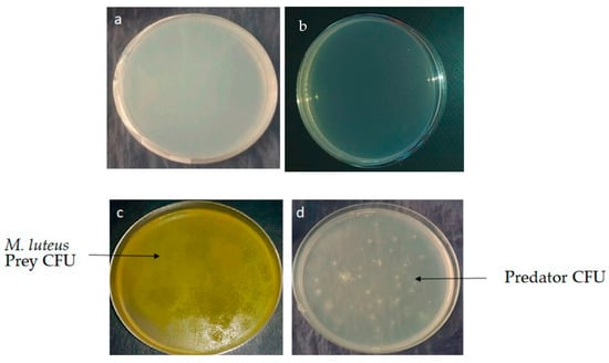 Predator isolation procedures and controls. (a) Plating of 1 mL of Micrococcus luteus at the concentration 1012 colony-forming units (CFU)/mL embedded in 20 mL of molten agar-agar at 45 °C: no growth detected; (b) plating of 100 µL of a water marine sample dilution on the surface of 20 mL of agar-agar: no growth detected; (c) growth of 1 mL of M. luteus at the concentration 1012 CFU/mL embedded in 20 mL of molten agar-agar at 45 °C flooded by 1 mL of nutrient broth; (d) growth of potential predators able to use M. luteus as a nutritional source.