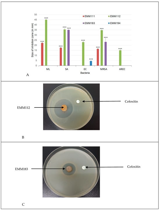 (A): Comparative bar graph showing the size of inhibition zones in mm for the four non-obligate predatory Actinobacteria using Bennett medium against different bacteria. Each value represents the mean ± SD of three replicates; ***p < 0.001 indicates significant differences compared the agar cylinders of Bennett medium using two-way analysis of variance (ANOVA). ML: M. luteus, S: Staphylococcus aureus, EC: Escherichia coli, MRSA: methicillin-resistant S. aureus, AREC: ampicillin-resistant E. coli; (B): Antibacterial activity of EMM112 using Bennett medium against MRSA; (C): Antibacterial activity of EMM183 using Bennett medium against MRSA.