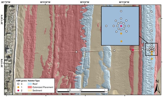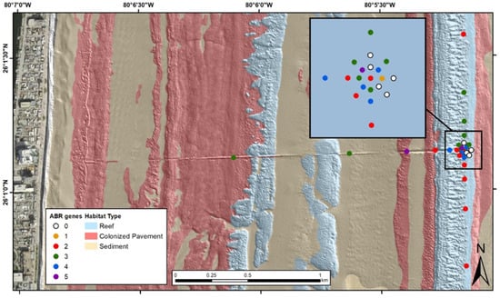 Wet season (June 2018) map of sampling locations and habitat type, Hollywood, Florida, treated wastewater outfall pipe. The number of antibiotic (ABR) genes detected in each sediment sample is listed in the legend. DNA extracts from water collected from the wastewater treatment plant influent and outfall pipe boil were positive for 6 and 3 antibiotic resistance gene targets, respectively.