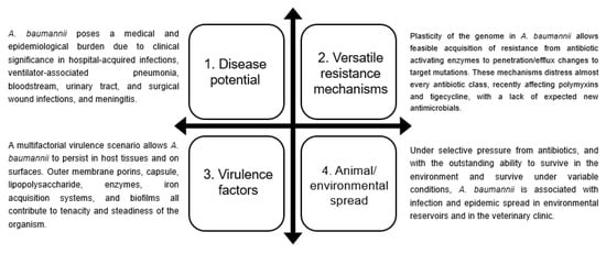 The dynamic microbiological nature of Acinetobacter baumannii derives from an interplay between the associated infections, wide arsenal of virulence factors, multidrug-resistant phenotype, and spread in animals and the environment.