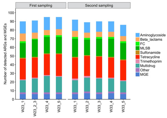 Number of detected antibiotic resistance genes (ARGs) and mobile genetic elements (MGEs) in each manure belt swab from the caged layer shed of each sampling visit on Farm L. The sampling was performed when the chickens were 23 weeks (W23) and 33 weeks old (W33). Sample 2 and 3 for W23 were combined to provide a sufficient biomass for processing. FC, fluoroquinolone/florfenicol/chloramphenicol; MLSB, macrolide-lincosamide-streptogramin B; MGE, mobile genetic element.