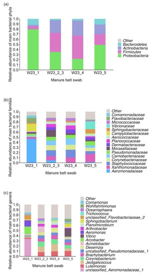 Relative abundance of dominant bacterial phyla (a), families (b) and genera (c) in the manure belt swabs of the first sampling in Farm L. Only taxa with relative abundance above 3% in at least one sample are shown. Taxa below the cut off were assigned as “other”.