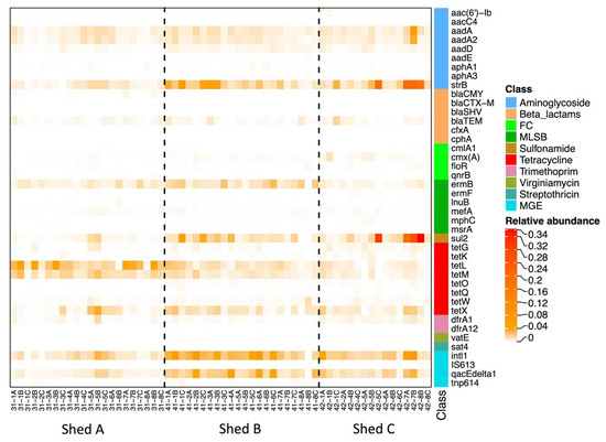Each shed was detected with 44 genes and the three sheds shared 42 genes. The relative abundance of genes detected in Farm B is shown in the heatmap (Figure 4). A total of 34 genes were detected in more than 80% samples (48 out of 60). The most abundant ARG was the aminoglycoside resistance gene strB, with a median relative abundance of 1.3 × 10−2. The next most abundant ARG was tetracycline resistance gene tetL, with the median relative abundance of 1.2 × 10−2, and the other two abundant tet genes were tetM and tetX. Other abundant genes were sul2, ermB, aadA and aadA2. In addition, the class I integron markers intI1 and qacE∆ were detected at high levels in the sheds, with median relative abundances of 1.8 × 10−2 and 1.1 × 10−2, respectively (Table 2). Relative abundances of these genes were further compared among the sheds using a pairwise Wilcoxon rank sum test. Three genes (tetX, aadA and aadA2) showed no significant differences in abundance between sheds. Shed A had significantly different abundances of gene tetL, tetM, strB, sul2, ermB, intI1, qacE∆ compared to shed B and/or shed C (p < 0.05). Sheds B and C had significantly different abundances of gene tetL, ermB, intI1 and qacE∆ (p < 0.05). The ARGs with high human clinical importance, such as the beta lactamase resistance genes blaSHV, blaCTX-M, cphA, the fluoroquinolone resistance gene qnrB and the virginiamycin resistance gene vatE, detected at very low abundances (~10−6 to 10−5) in the samples.
