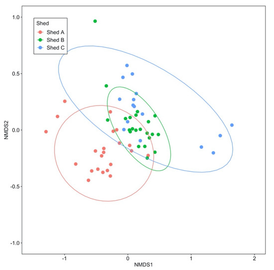 NMDS using Bray–Curtis distances to compare the similarity of ARG profiles of the manure belt swabs between the sheds in the broiler breeder Farm B. The ellipses indicate 95% confidence region of each cluster.