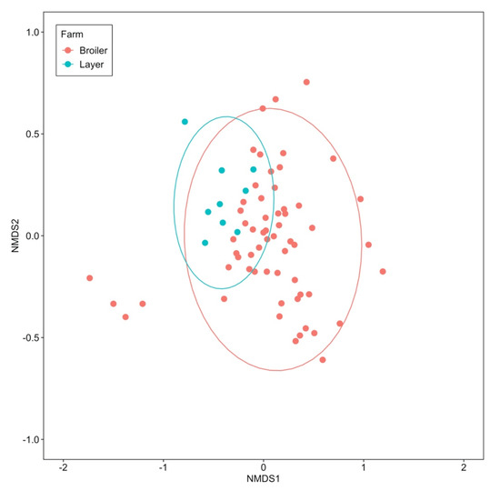 The ARG profile of manure belt swabs of Farm B was further compared to that of the layer Farm L. NMDS analysis was based on the relative abundance of 33 ARGs detected in both farms. No significant difference was found between the two farms (R = 0.17, p = 0.08, ANOSIM) (Figure 6).