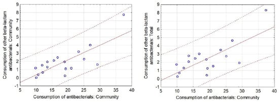 Scatter diagram with 95% prediction curve for significant correlations between the respective categories of Community and Total Consumption of antibacterials (ATC group J01) for systemic use in the hospital/community sector and Consumption of other beta-lactam antibacterials (ATC group J01D) for systemic use in the hospital/community sector for all of the included European countries.