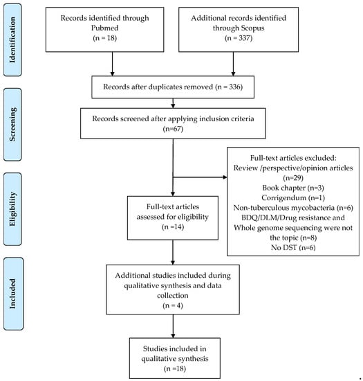 In the initial search, 337 published studies were found after merging duplicates. Later, we applied the inclusion and exclusion criteria, selecting 14 articles for qualitative analysis. We added four publications during the reading and synthesis step, giving us a total of 18 articles selected for this review. The workflow was summarized using the Preferred Reporting Items for Systematic Reviews and Meta-Analyses (PRISMA) diagram (Figure 2) []. Analyzed variables are described in Tables S1–S3. Most of the studies reported resistance to BDQ (17/18, 94.4%), compared to DLM (6/18, 33.3%). The initial reports of BDQ and DLM resistance through WGS were published in 2014 and 2015, respectively (Table S1) [,], one year after these drugs were endorsed for the treatment of MDR-TB patients [,]. Ten studies included Mtb strains from MDR/XDR-TB patients. The number of patients in these studies ranged from 1-517 (Table S1). Seven studies evaluated laboratory strains (H37Rv and ATCC strains such as ATCC35822, among others), including in vitro induced or spontaneous mutants after exposure to BDQ [], and strains that developed BDQ resistance in the mouse model [,].