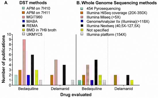 For this review, we focused on mutations identified only by next-generation WGS, which are summarized in Table 2. The WGS methods used for evaluating resistance associated mutations (RAM) for each drug are described in Table S1 and Figure 3B. The Illumina NextSeq was the most frequently used platform for both drugs (Figure 3B). A significant advantage of Next Generation Sequencing (NGS) over traditional Sanger sequencing is its deeper coverage []. In the articles reviewed here, the coverage ranged from 5X-350X, reaching the highest coverage through Illumina HighSeq4000 [] (Figure 3B), with higher confidence for detecting genetic variants. Additionally, eight studies confirmed mutations through other genotypic methods (PCR-based Sanger sequencing or targeted deep sequencing) (Table S1).