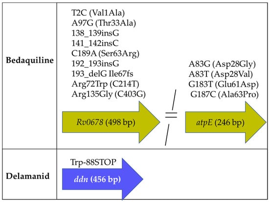 Drug resistance (DR) can be determined either by phenotypic or genotypic methods. Currently, phenotypic resistance to BDQ and DLM is determined using provisional critical concentration values defined by the WHO or the European Committee on Antimicrobial Susceptibility Testing (EUCAST) [,]. However, the established thresholds for BDQ or DLM resistance are highly variable and influenced by the type of culture system used []. Regarding molecular makers of resistance, current data suggest that BDQ resistance is associated with mutations in the drug target atpE, which encodes for the subunit c of the ATP synthase complex. Additionally, off-target mutations at Rv0678, pepQ (Rv2535c), and Rv1979c are linked to BDQ resistance []. Similarly, off-target mutations at ddn (Rv3547), fgd1 (Rv0407), fbiA (Rv3261), fbiB (Rv3262), and fbiC (Rv1173) were associated to DLM resistance [,,]. Resistance mechanisms for BDQ and DLM can be found in previous reviews [,,].