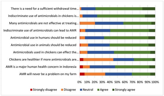 The questionnaire sought farmer opinion on the importance of AMR concerns and the role of antimicrobial use practices in broiler production (Figure 1). More than two thirds of respondents agreed that the indiscriminate use of antimicrobials could result in high costs for farmers (76%) and 79% identified that it was necessary to adhere to antimicrobial withdrawal times before harvesting broilers for slaughter. The majority of farmers also identified that AMR is a major human health concern in Indonesia (53%), that antimicrobial use in chickens can affect the health of the consumer (54%), that the indiscriminate use of antimicrobials can lead to AMR (58%) and that antimicrobial use should be reduced in human (67%) and veterinary medicine (61%). Conversely, the majority of respondents did not agree that the health of chickens improves if more antimicrobials are used (45%). More than a quarter (30%) of the farmers held the opinion that AMR will never be a problem on their farms. Overall opinion was divided on whether antimicrobials were effective in treating disease. This divided opinion fits with the issue that antimicrobials are often applied to diseases that are viral [37].