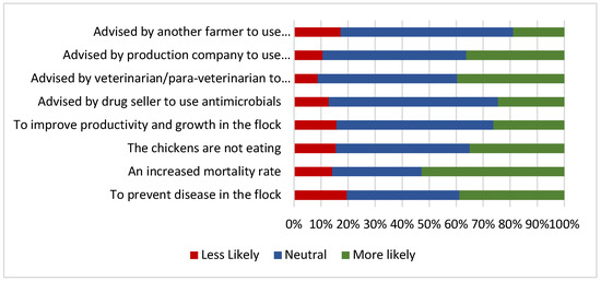 The study also explored drivers for antimicrobial use by broiler farmers (Figure 2). The majority of respondents reported that an increased mortality rate (52%) would lead to increased antimicrobial use. In addition, 39% of respondents identified that disease prevention was a motivation for antimicrobial use. Conversely, a minority identified that inappetence in the flock (35%) and improving growth and productivity (26%) would influence their antimicrobial use behaviours. Advice from drug sellers, veterinarians/para-veterinarians, the contract company and other farmers was not considered to either positively or negatively influence antimicrobial use behaviours by the majority of respondents. There were some significant differences between the drivers of antimicrobial use in contract and independent farmers. Contract farmers were significantly more likely to report using antimicrobials to prevent disease (p = 0.036) and to use antimicrobials based on advice from a contract company (p ≤ 0.0005) when compared with independent farmers (p = 0.036).
