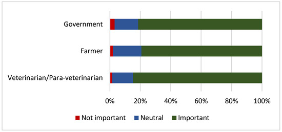 Respondents were asked to consider the role of different actors in monitoring the responsible use of antimicrobials in broilers (Figure 3). The majority of respondents considered that veterinarians/para-veterinarians (85%), the government (81%) and farmers themselves (79%) were important in monitoring the responsible use of antimicrobials in broilers. There were some significant differences observed between the contract and independent farmers’ opinions on the roles of different actors. Contract farmers were significantly more likely to consider veterinarians (p = 0.001) and the government (p ≤ 0.0005) to have a neutral role in monitoring the responsible use of antimicrobials in broilers in comparison to independent producers.