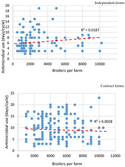 There was a total of 363 farms that provided estimates of the number of days that they provided antimicrobials to their latest batch of birds, 150 of these were independent farmers and the remaining 213 were contract farmers. Each data point in Figure 4 represents a farmer’s estimate of days that antimicrobials were used in the last batch of broilers.