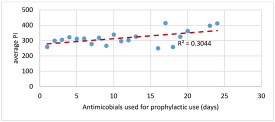 The correlation between average performance index (PI) and antimicrobials use for prophylactic reasons.