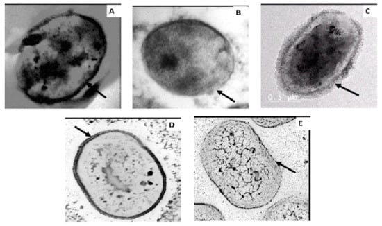 In our study, we used TEM to compare morphological changes in the cell membranes of clinical colistin-sensitive (MS48Col-S, MS64Col-S), clinical colistin-resistant (MS34Col-R), and induced colistin-resistant (MS48Col-R, MS64Col-R) strains. The five A. baumannii strains were sub-cultured in Nutrient broth (NB) (LAB M, USA) for 24 h. Bacterial cells were centrifuged (4000 rpm/10 min), washed with distilled water, and immersed in a freshly prepared 1% (w/v) aqueous potassium permanganate solution for 5 min at room temperature for fixation. Dehydrated specimens were embedded in epoxy resin. Suspensions were submitted to the Regional Center for Mycology and Biotechnology (RCMB), Al-Azhar University, Cairo, Egypt, for agarose embedding and thin-section preparation. Sections were placed on carbon-coated grids and viewed in a JEM-1010, 120-kV transmission electron microscope (JEOL, Peabody, MA, USA) [50]