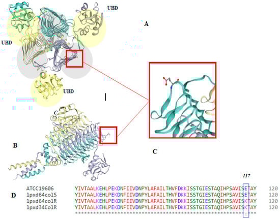 Predicted 3D model structure of MS64Col-R LpxD protein. (A) Orthogonal view of the trimer, showing three chains where the lipid-binding domain (LBD) is colored in grey shades. (B) Side view of the trimer. (C) Amino acid substitution position (117). (D) Amino acid sequence alignments of a part of the LpxD protein of the colistin-sensitive reference strain (ATCC19606), colistin-sensitive clinical isolate (64colR), colistin-resistant laboratory-induced isolate (64colR), and colistin-resistant clinical isolate (34colR), generated by online Clustal W–Model server. UBD: uridine-binding domain.