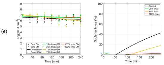| LED | Imax (%) | Log10 N0 (Log(CFU cm−2)) | kmax (min−1) | RMSE | Log10 N0 (Log(CFU cm−2)) | kmax (min−2) | RMSE | ||||