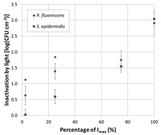 3.1. P. fluorescens and S. epidermidis Inactivation by LEDs